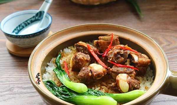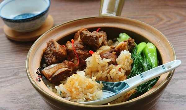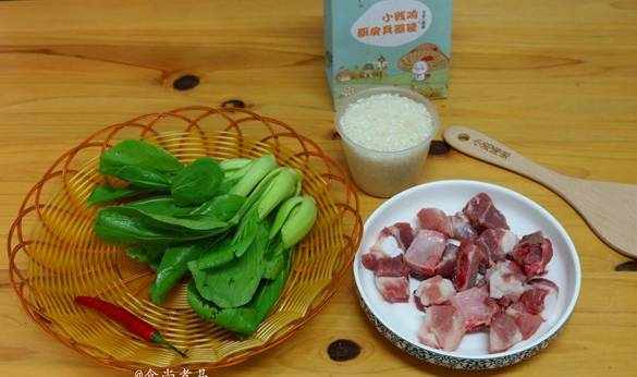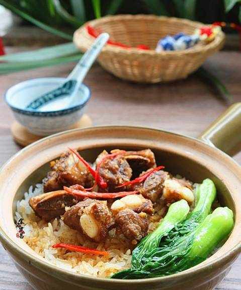【食材】兩人的飯量,大米140克、小排200克、小唐菜4棵、小辣椒1個、煲仔飯所用清水170克、鹽3克、油少許、蒜蓉面豉醬1湯匙、香油少許、蠔油5克、雞粉少許、淀粉少許、白糖少許、醬油5克