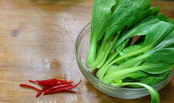 小唐菜浸泡片刻洗凈、撈起掰開,辣椒洗凈切絲