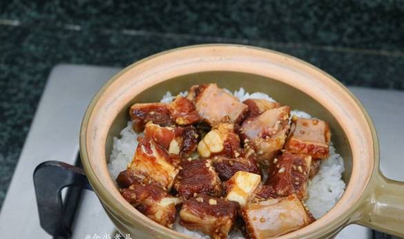 將醃制好的排骨均勻鋪在米飯上面,不要全部疊在一起,影響熱氣均勻滲透,些許的湯汁一同倒進去、遮上鍋蓋,小火燜焗15分鐘,關火後再燜5分鐘再揭蓋