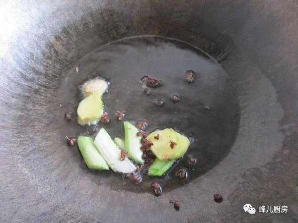 3、鍋裡放油,加入蔥段、薑片,花椒、八角,大火爆香。