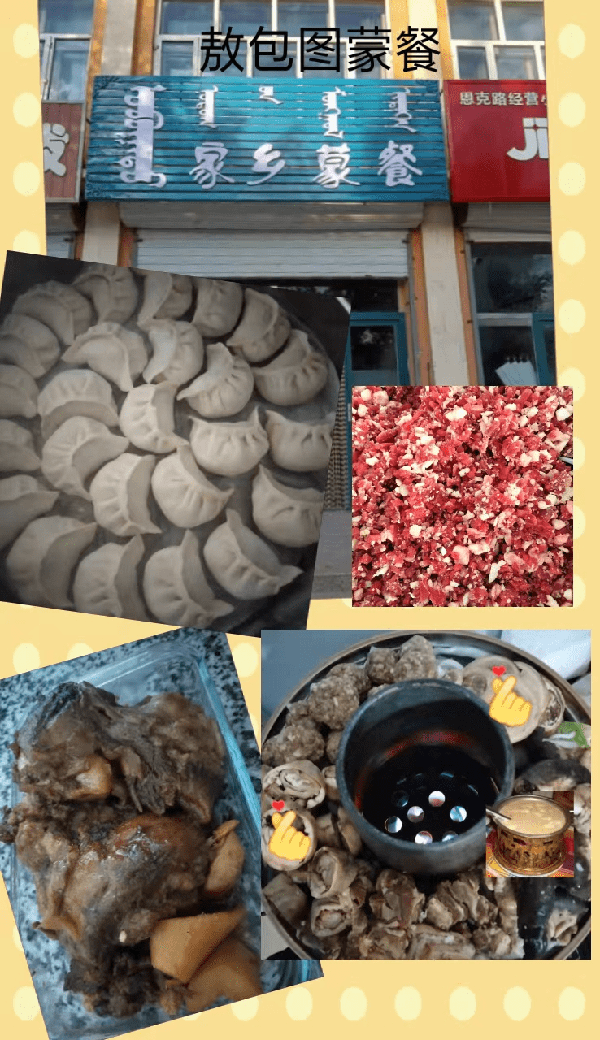 我們用的是自傢放牧的肉羊肉,用傳統的烹飪方式制作傢鄉風味美味佳肴,真正的傢鄉蒙餐,有傢的味道。本店有蒙古包子,蒙古面,餃子,手把肉,果茶,裝鍋及牛羊肉各類炒菜,燉肉,湯類,這些都是蒙古特色美食,希望以我們熱情純正的美食,歡迎五湖四海的朋友......