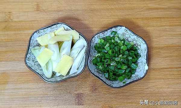 【步驟三】:把生薑和大蔥切成片、香蔥切成末,然後裝盤備用。