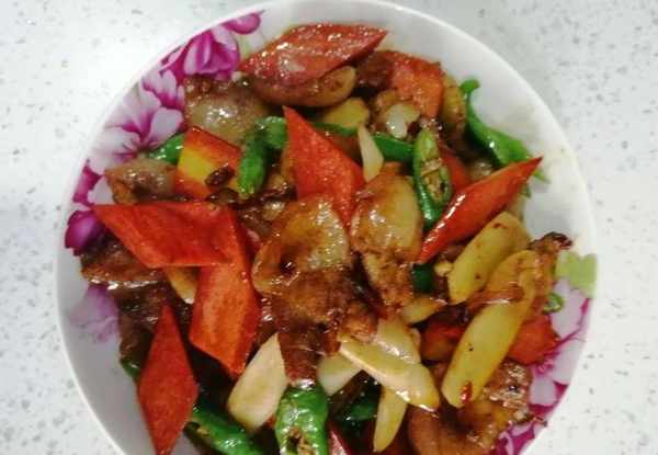 6、倒入胡蘿卜和子薑,開大火翻炒至斷生,然後放入青椒和蔥節,繼續翻炒十幾秒鐘,最後放入耗油,雞精翻炒均勻即可起鍋,期間基本上不要放鹽,因為豆瓣醬,醬油有鹽,如果配菜多,可能需要嘗嘗,根據需要添加。