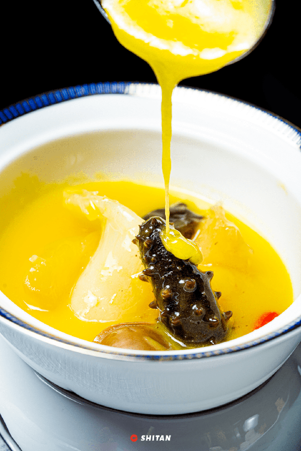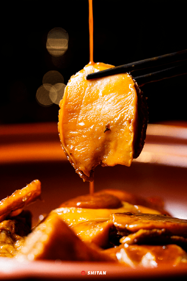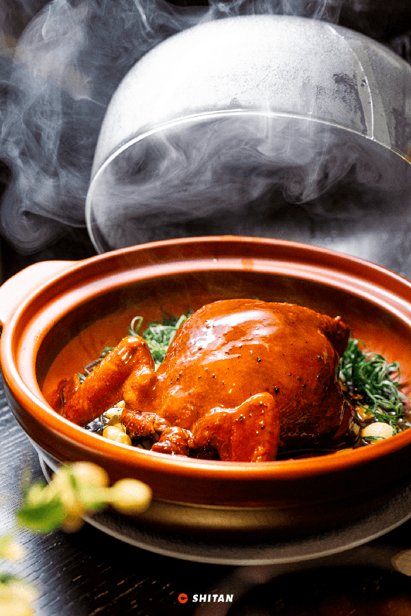新鮮的八頭鮑、龍紋參和鮮豬手經過低溫慢煮,再填入拆完骨的清遠雞,經過慢火細煲才可出鍋。上桌後淋上鮑魚汁,香味絲絲入扣。雞肉軟糯咸鮮。