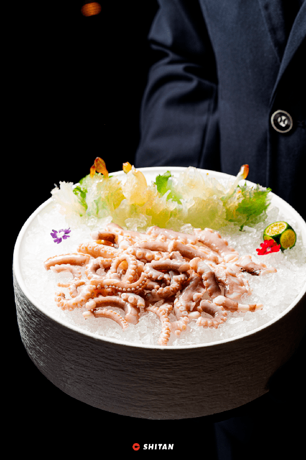 “十斤海蜇八斤水”,盤上屈指可數的海蜇卻是用幾斤海蜇做出來的精品。來自舟山的海蜇,經過三次鹽醃後更加晶瑩剔透,口感也愈發爽脆。搭配手工捶打斷筋的八爪魚,蘸上調料,夏天來這麼一盤簡直絕瞭。