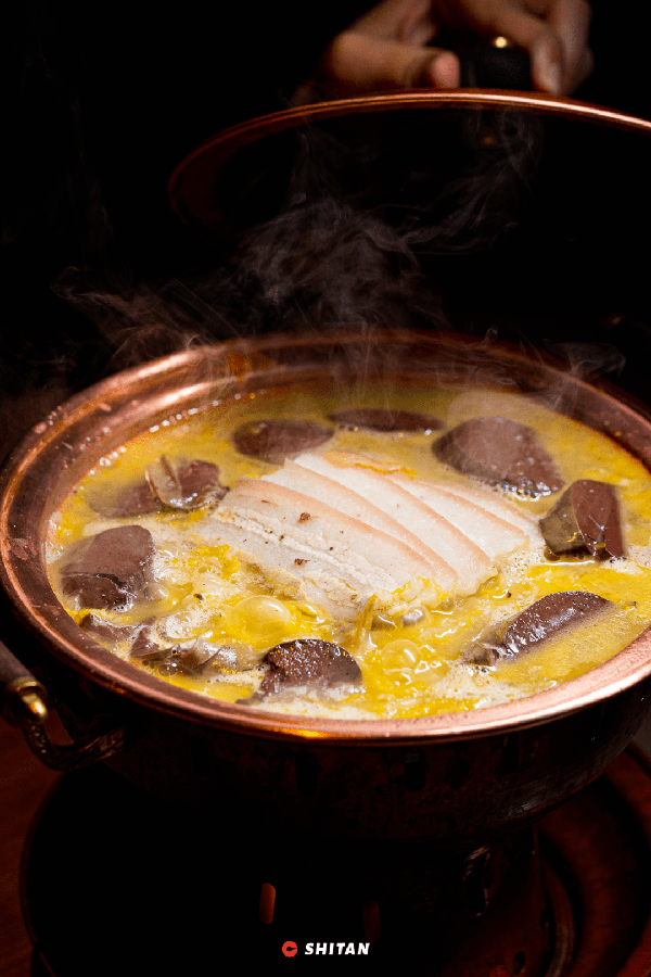 東北鐵鍋燉有機魚頭,選自千島湖的鳙魚魚頭,用傳統慢燉的技法,將魚頭的膠質和精華都融入到魚肉中,魚肉肉質緊實不柴,有著極濃鬱的醬香味。墊底的還有東北菜中不可或缺的肉茄子、大白菜、寬粉、大豆腐。