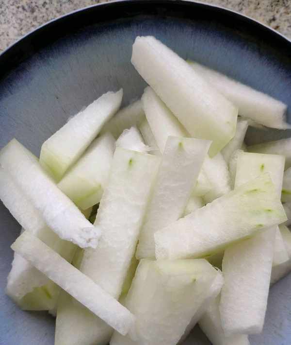 2、把冬瓜切條,一定不要太細瞭,如果冬瓜太細,煮的時候會煮化掉。