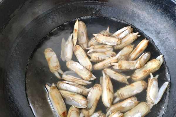 3、鍋中加入水,把蟶子下鍋焯水,開口後蟶子裡面的沙會出來,整體變得更幹凈。