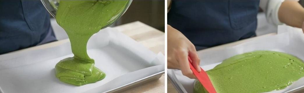 12.將面糊倒入鋪有羊皮紙的烤盤中,用矽膠糕點刮刀將面糊均勻地攤開。