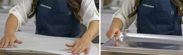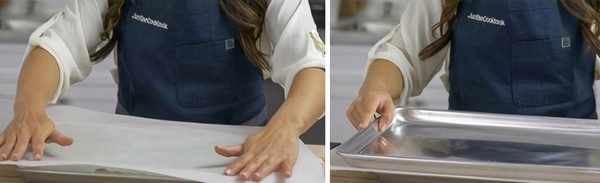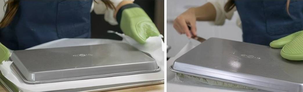 19.拿住兩個烤盤,將蛋糕翻過來,使棕色的一面朝上,取下羊皮紙。