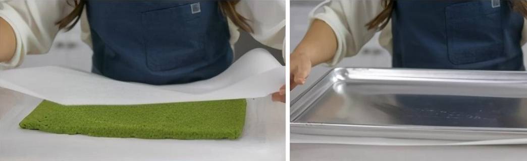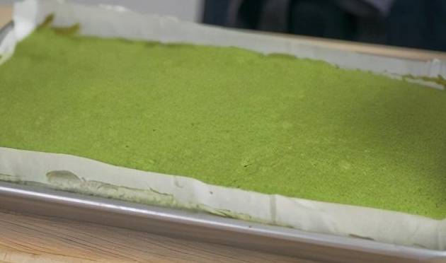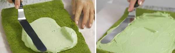 26.用刮刀將抹茶奶油混合物均勻地鋪在蛋糕上,各邊留1.5厘米的邊框。小貼士:在蛋糕的最後1/3處少塗抹些奶油,因為奶油在卷起時會堆積到最後。