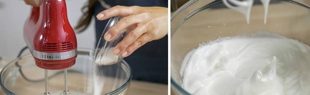 7.分三次加入糖(?杯,50克),直至有小尖尖並且蛋清變得光滑。