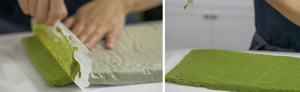 17.輕輕取下蛋糕上的羊皮紙,這面將是瑞士卷的外表,所以要輕柔!