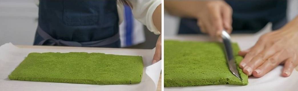 20.取下烤盤,將蛋糕放在工作臺上,斜著將蛋糕的一側(較短的一端)切除約1厘米,以便卷起瑞士卷。