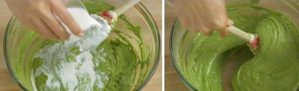 10.加入過篩好的粉,用矽膠刮刀輕輕地折疊直到完全合並。提示:最後添加幹成分不要過多攪拌(過度攪拌會導致密實而不是蓬松的海綿蛋糕)。