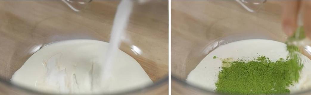 準備抹茶奶油餡23.蛋糕完全冷卻後,碗中加入奶油、糖和抹茶粉。