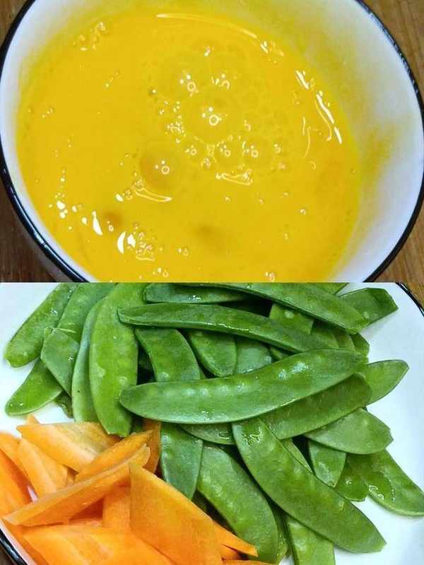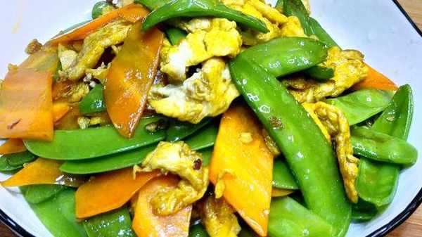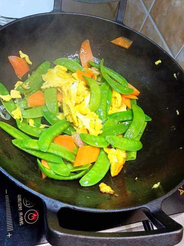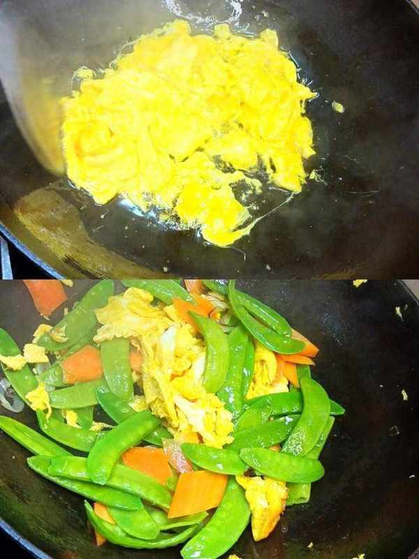 鍋燒以後熱放入適量食用油,倒入雞蛋炒至雞蛋定性沒有蛋液,把雞蛋扒至過的邊緣倒入荷蘭豆胡蘿卜翻炒,加入適量鹽、蠔油炒至荷蘭豆胡蘿卜斷生即可盛出裝盤