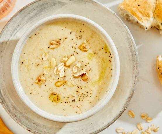 3,加入20克磨碎的燕麥粉、鹽和黃油,以30秒/速度10調和。盛入碗內,撒上黑胡椒粉,趁熱享用。
