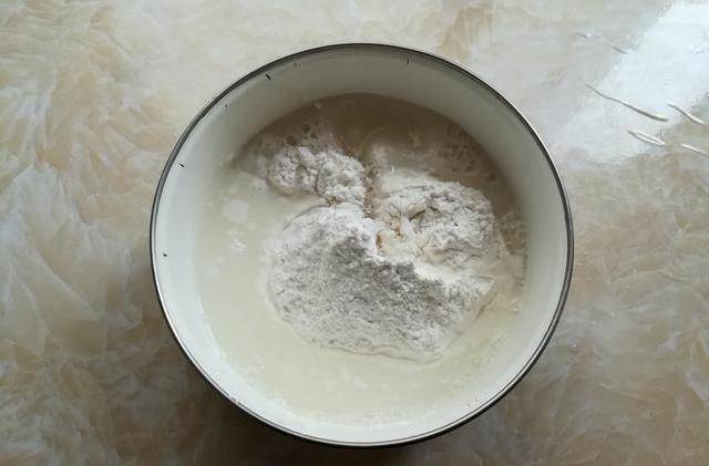 準備一個幹凈的深碗,放入糯米粉,倒入熱開水,用筷子簡單攪拌到沒有幹粉的樣子。