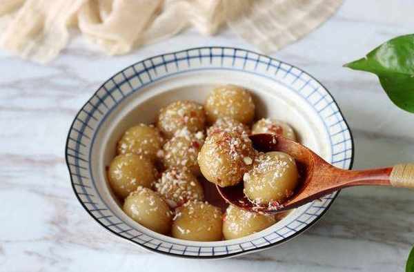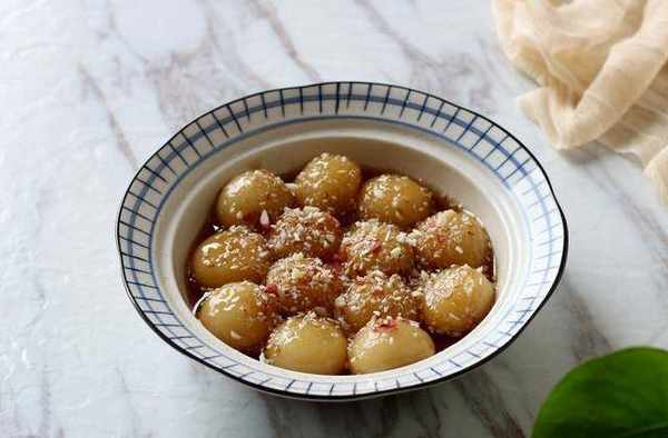 小鍋裡的糖水煮到有些濃稠的時候,放入煮熟的糯米丸子,煮幾分鐘,裹上一層淺黃色的糖漿。