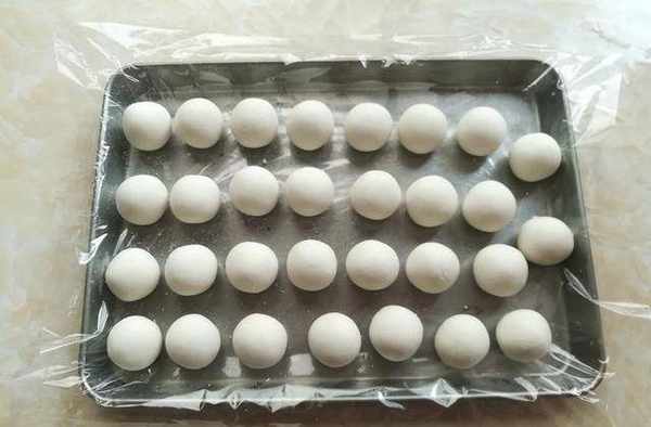 取適量的糯米粉面團,揉圓放到鋪瞭保鮮膜的盤子裡。糯米丸子可以一次性多做一些,放冰箱裡冷凍起來。想要糯米丸子每個大小都一樣,建議用電子秤稱一下重量,我揉的是10克一個的糯米丸子,不用包餡,比做湯圓省事多瞭。