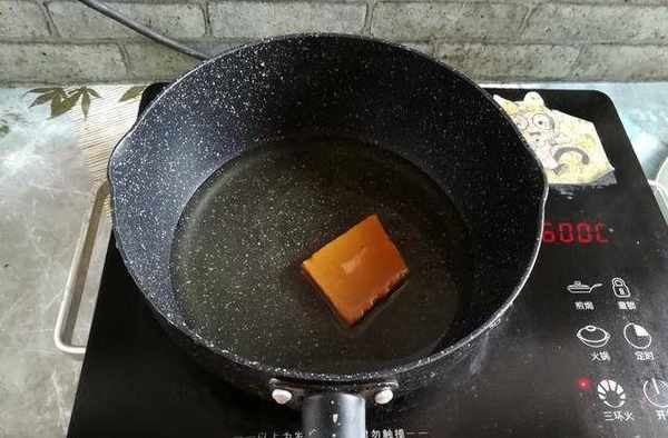 小鍋裡放適量的水,按照個人口味放入適量的黃片糖,煮到糖塊融化。