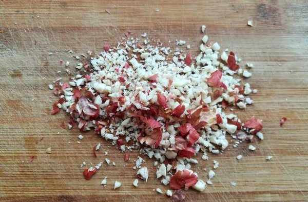 紅皮花生用搟面杖搟碎,或者是用菜刀切碎。