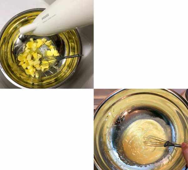 第三步 將蛋液分兩次加入黃油裡面!用電動打蛋器攪拌均勻(等上一次的蛋液被黃油充分吸收瞭再加入下一次的蛋液。混合均勻好瞭)