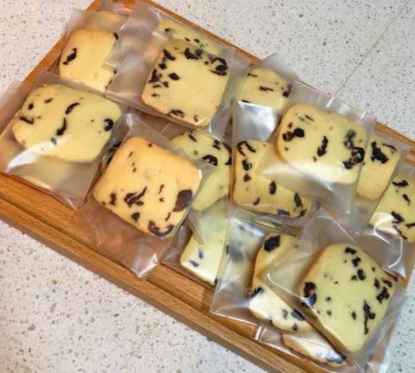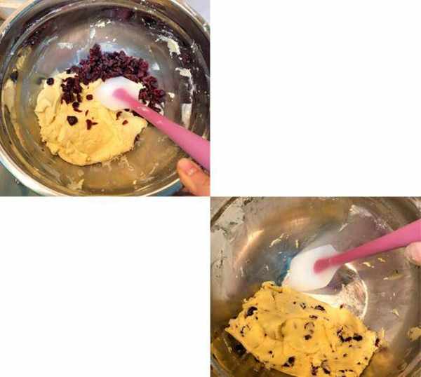 第五步 蔓越莓切碎 倒入到面粉和黃油裡面用刮刀或者手把它們攪拌均勻,混合到沒有幹粉的狀態。
