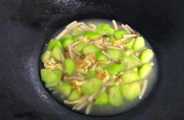 2、鍋中倒入適量油,把切好的絲瓜放入鍋中,煸炒炒後加入沒過絲瓜的水,再把焯過水的白玉菇一起放入鍋中,煮開後加入適量鹽調一下味,放入雞蛋起翻炒均勻後即可熄火。