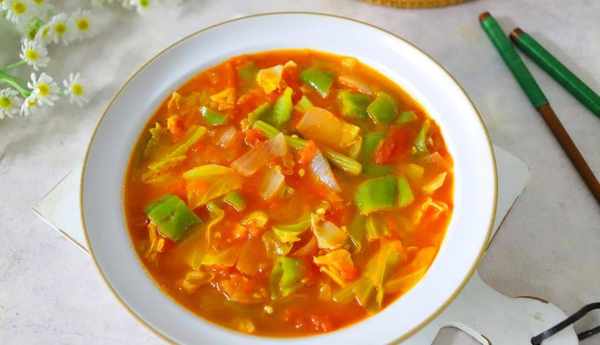 2、鍋中倒入適量油,放入蒜末煸炒出香味後加入番茄炒至番茄變軟出沙,加入1大碗清水,大火轉中火煮5分鐘左右,分次放入處理好的洋蔥,芹菜,卷心菜,青椒,中火燉至蔬菜變軟加入適量鹽調味翻拌均勻就可以關火瞭。
