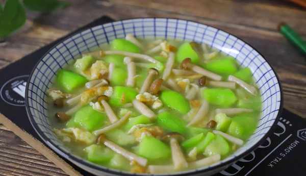 【做法】:1、蟹味菇切去根部切成小段,清洗幹凈後放入鍋中焯下水後撈出待用,雞蛋炒熟盛出,絲瓜去皮洗凈,切成滾刀塊。