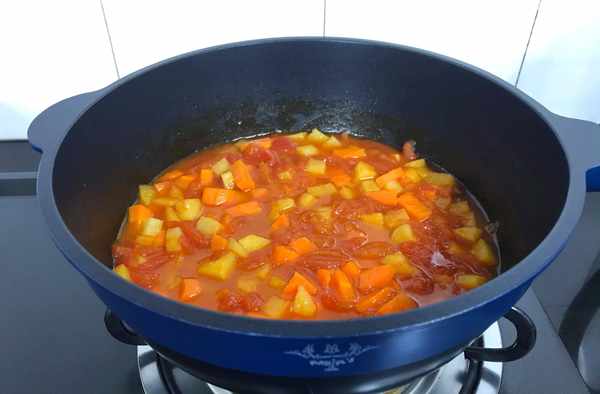 2、鍋中倒入適量油,放入番茄翻炒至番茄成醬出汁,放入土豆丁一起翻炒均勻,加入沒過食材的開水,煮開後放入胡蘿卜丁,加入適量鹽,1勺生抽調味,煮至湯汁開始變濃稠時再加入1勺番茄醬煮開後加適量糖,拌勻後煮開就可以關火瞭。