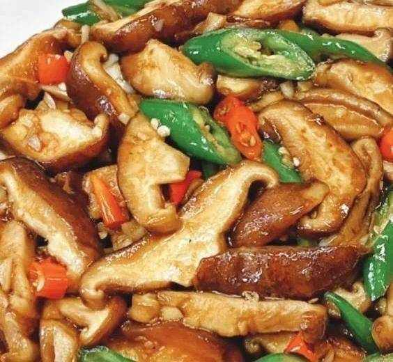 3.鍋裡倒油放蒜炒香,放辣椒,下香菇翻炒,加鹽調味,出鍋前倒入碗汁調味出鍋