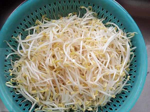 1、新鮮的綠豆芽洗幹凈後,裝在瀝籃裡瀝幹水分。青紅辣椒去掉辣椒蒂和辣椒籽,洗幹凈後切成細絲。大蒜洗幹凈,拍成蒜粒,生薑和幹辣椒切碎。