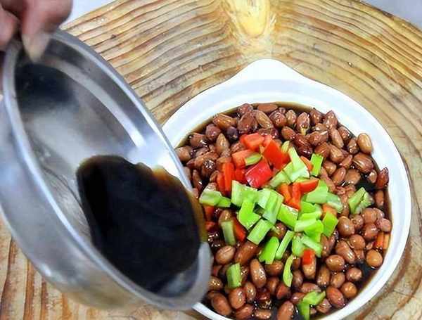 2、準備一個空碗,加適量陳醋、生抽、食鹽、雞精、白糖攪拌均勻。把瀝幹水分的花生倒進盤子裡,撒上青紅辣椒碎,淋上調好的料汁,攪拌均勻後浸泡3個小時就可以食用瞭。