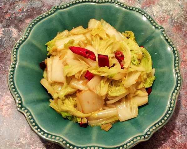2、鍋裡加適量的食用油,油熱後加花椒、薑絲和幹辣椒煸炒出香味。倒入切好的大白菜,開大火翻炒均勻後,倒入剛剛調好的料汁,繼續大火翻炒片刻就可以出鍋瞭。因為炒白菜需要大火快炒,所以料汁提前準備好,快要出鍋時倒入翻炒均勻,白菜會更加爽脆入味。