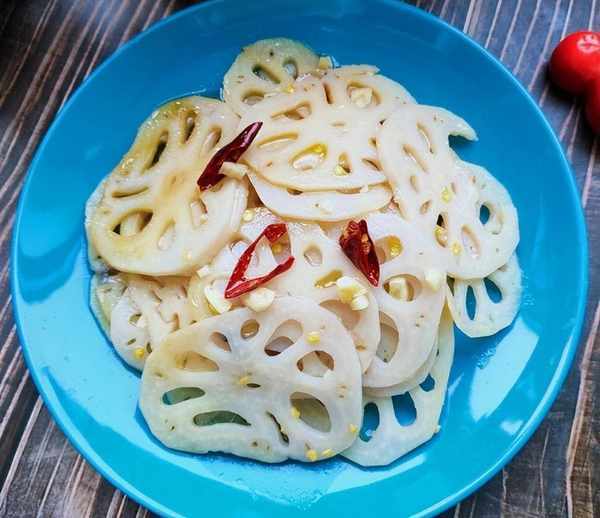 1、選兩節新鮮的蓮藕,刮掉外皮,切成片。鍋裡加足量的清水,大火把水燒開後,把切好的蓮藕倒進鍋裡焯熟。撈出過一遍涼水後瀝幹水分。藕片過涼水後吃起來的口感更加香脆。大蒜剝掉外皮,用刀拍碎,幹辣椒用刀切碎。