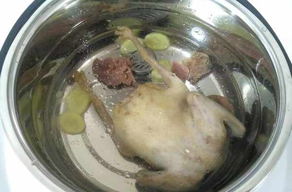電飯鍋裡加入適量清水,放入鴿子和薑片,順帶著也把鴿子肝,心放進鍋裡吧,雖然肉不多,但蚊子也是肉啊,不能浪費哈。