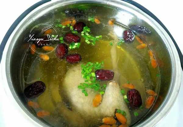 煮40分鐘後,加入紅棗和枸杞,調入調味料,再蓋上鍋蓋繼續燉煮10分鐘。