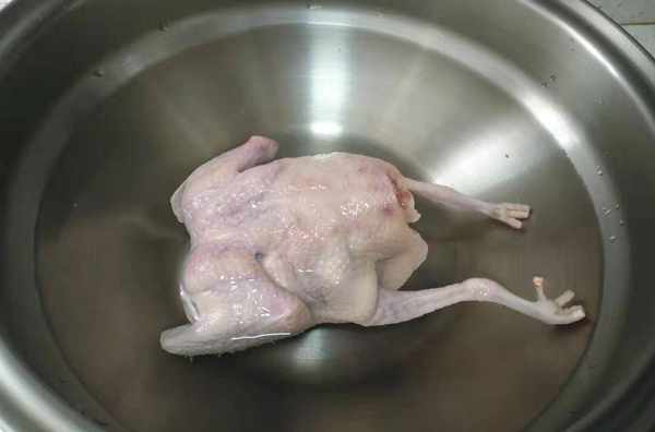 把鴿子頭部塞入胸腔裡,冷水下鍋焯水,水開後再煮5分鐘,撈起來用清水沖洗幹凈。