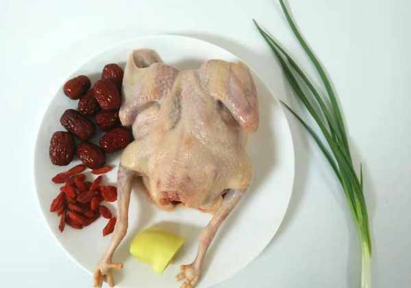 準備食材:鴿子1隻 紅棗10顆 枸杞1小撮 蔥1棵 鹽2小勺 胡椒粉1小勺 雞精1勺