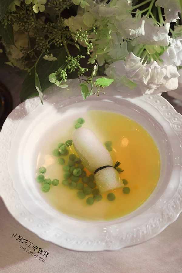 將春日鮮蔬,蜜豆、白蘆筍、黃耳包入竹蓀卷,以清雞湯?煮制,一卷包春,萬象春光。