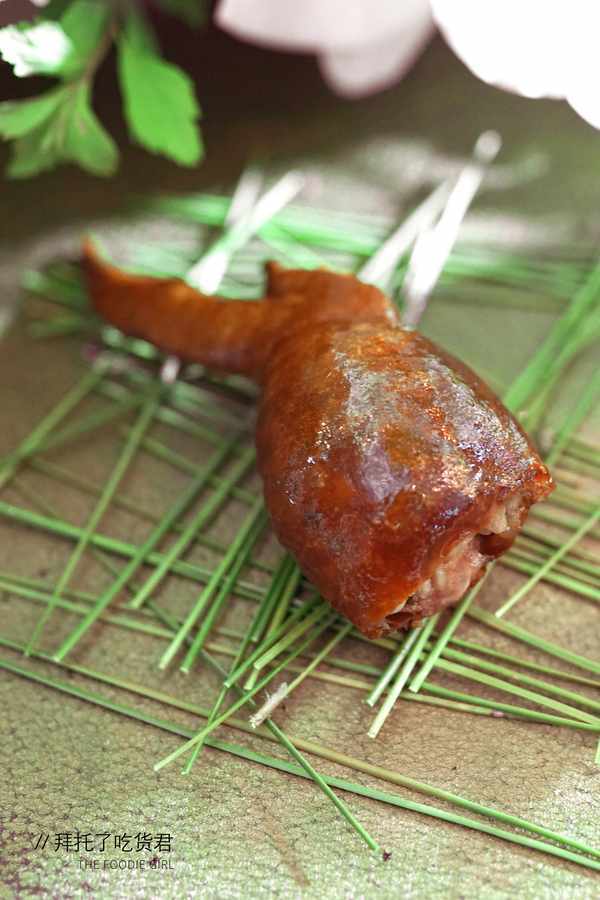 以糯米、刀板香、春筍填入雞中翅,加入馬爹利xo幹邑醃制,慢烤50分鐘,餡料和酒香滲透肌肉機理。