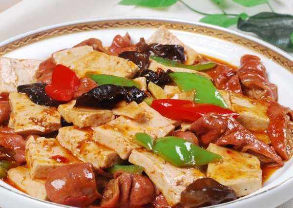 豆腐炒肥腸, 鹵肥腸用清水清洗一下,斜著切凌形。豆腐幹先切成開條再斜著切凌形,在沸水中焯一下撈出瀝水。香芹辣椒洗瞭也切凌形。鍋燒熱放少許油,入肥腸爆至皮卷起時推至鍋邊。加入豆腐炒至稍金黃。加入芹菜,鹽翻炒。放入辣椒,翻炒均勻出鍋。吃越過癮,吃後有回味的東西,讓人垂涎三尺!