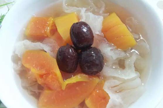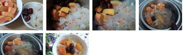 1.準備材料:木瓜(去皮去籽切塊);紅棗(去籽);白木耳(洗凈浸泡後撕成小塊)