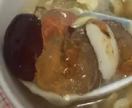 4煲滾水,落桃膠,紅棗,連子,百合同煮5)水再滾後中小火煲45分鐘,落冰糖,溶化後就完成