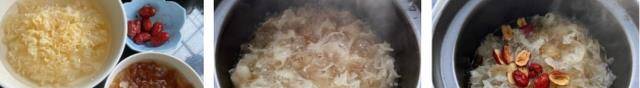1桃膠用水浸過夜,將雜質去除,再用水清洗備用。雪耳浸軟後洗凈撕成小塊,紅棗剪半去核備用。