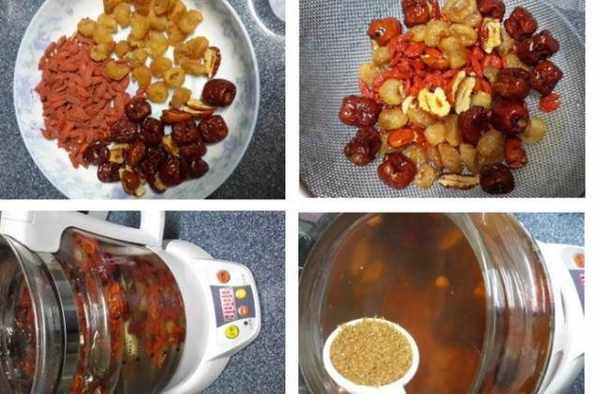 2將泡發好的材料濾幹水分倒入養生壺中,加入適量清水,按花茶鍵即可;(如果是其他鍋類,大火燒開後轉小火,燉30分鐘左右即可。)