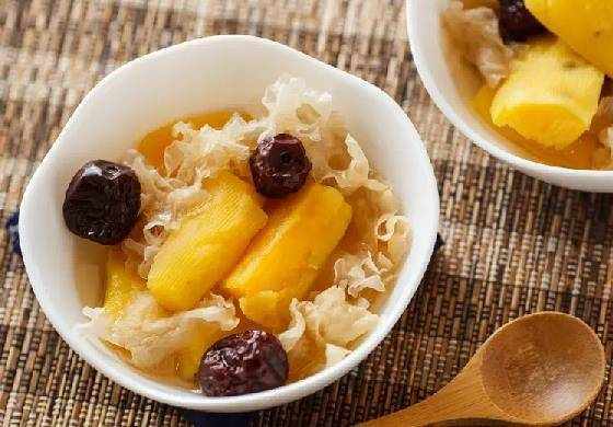 先將白木耳泡水20分鐘後,將雜質洗幹凈,並撕成小朵容易入口的大小後備用。將地瓜去皮,切成小塊狀後備用。